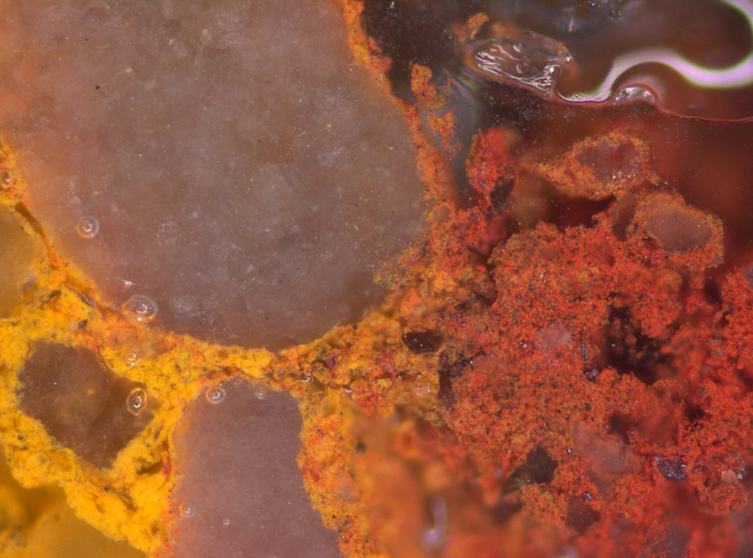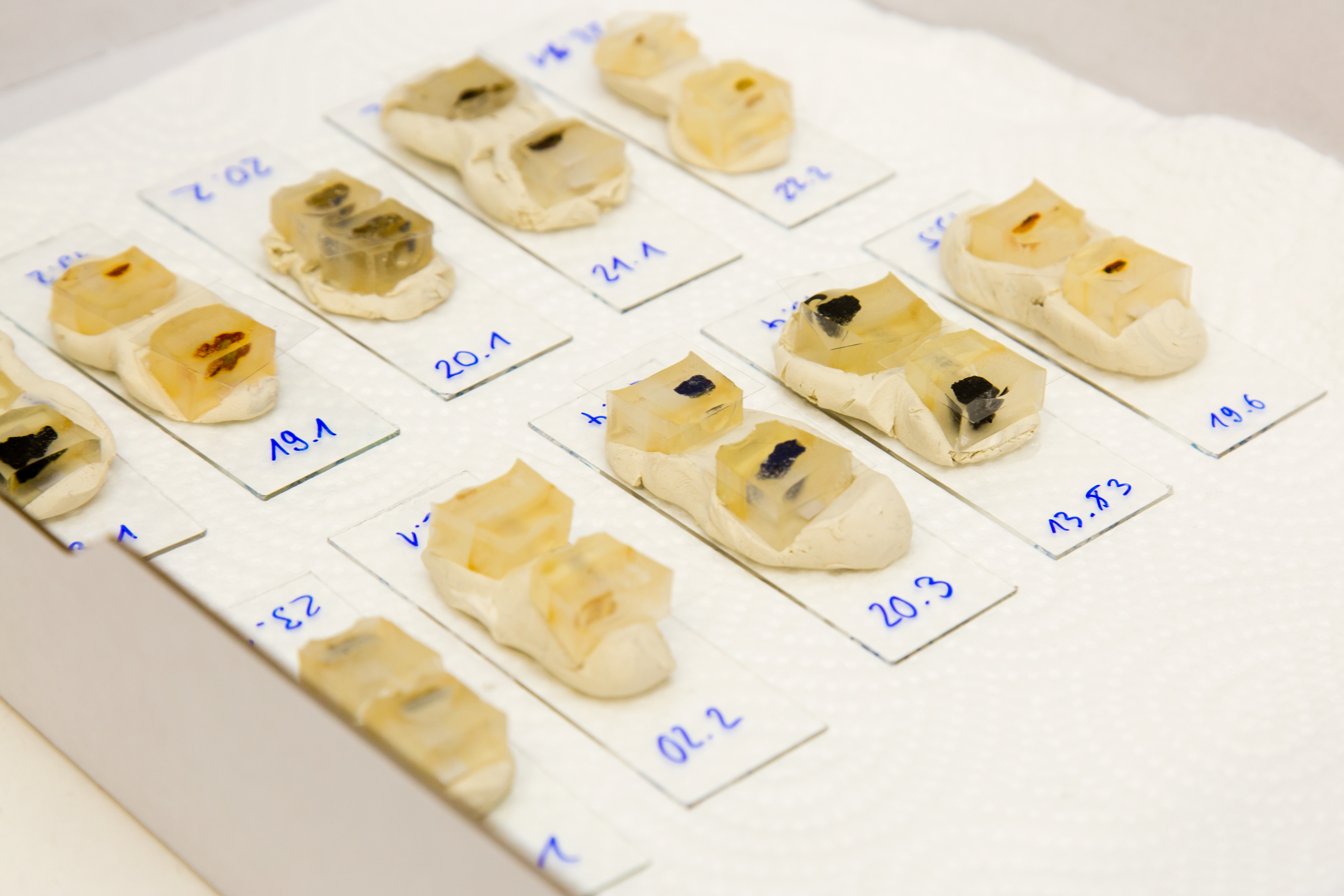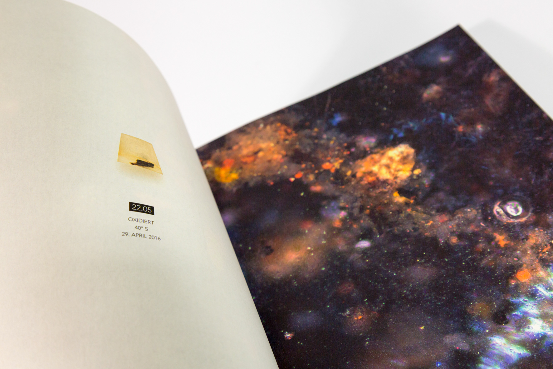 Bauschutt, Labor- und Vermessungsgeräte, Overalls, Atemschutzmasken, Fragmente in Kunstharz, Mikroskopaufnahmen, Vitrine, Publikation, Video