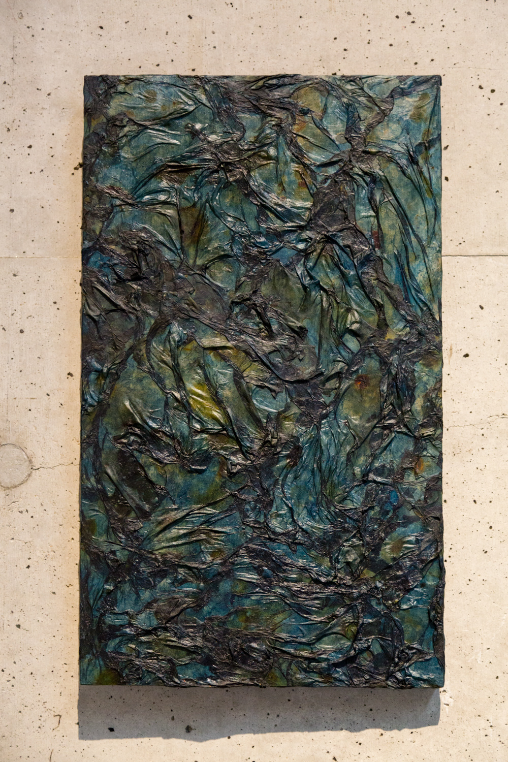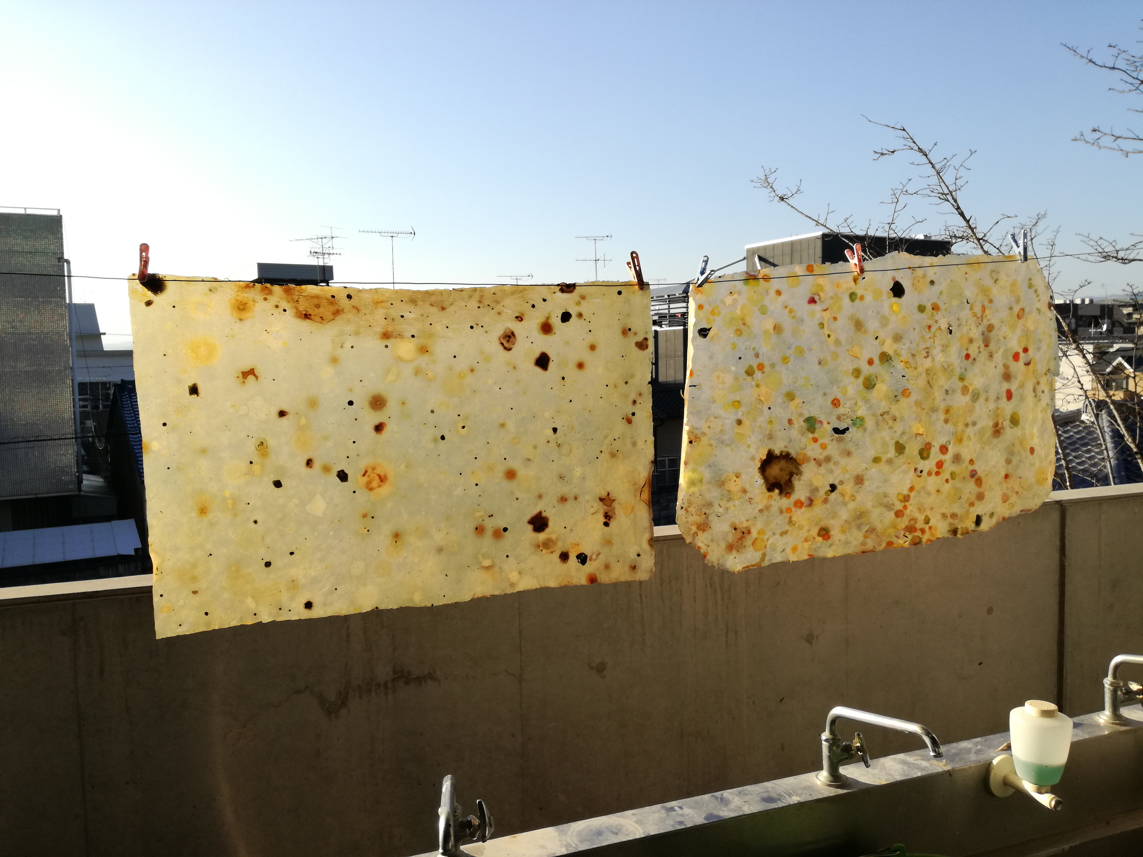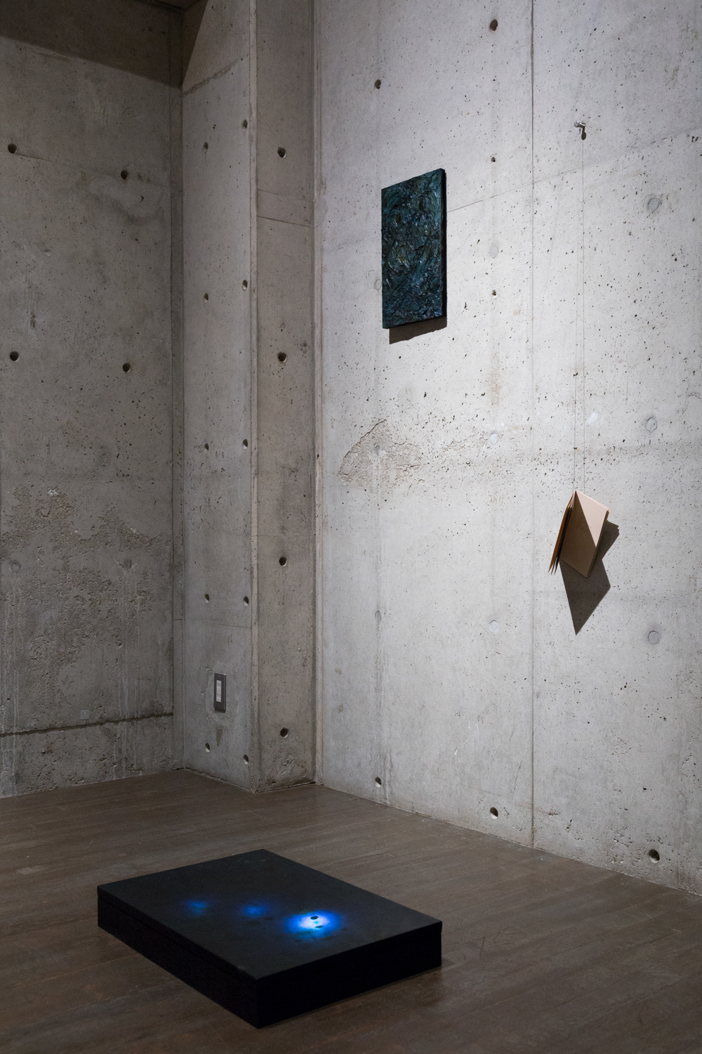 Die dreiteilige Installation untersucht Transformation, Identität und verkörpertes Wissen anhand eines organisch gewachsenen Kombucha-Materials, das während einer Japan-Residenz als forschendes Medium eingesetzt wurde. Durch Indigo-Färbung, Trocknung und Beleuchtung entsteht ein lebendiges Gefüge, das innere Zustände, kulturelle Einflüsse und biologische Prozesse sichtbar macht. Der Raum verbindet Licht, Materialoberflächen und fragmentarische Notizen zu einem offenen Erkenntnisfeld. Die Arbeit thematisiert Instabilität, Übergänge und die Beziehung zwischen körperlichem Empfinden und materieller Form.