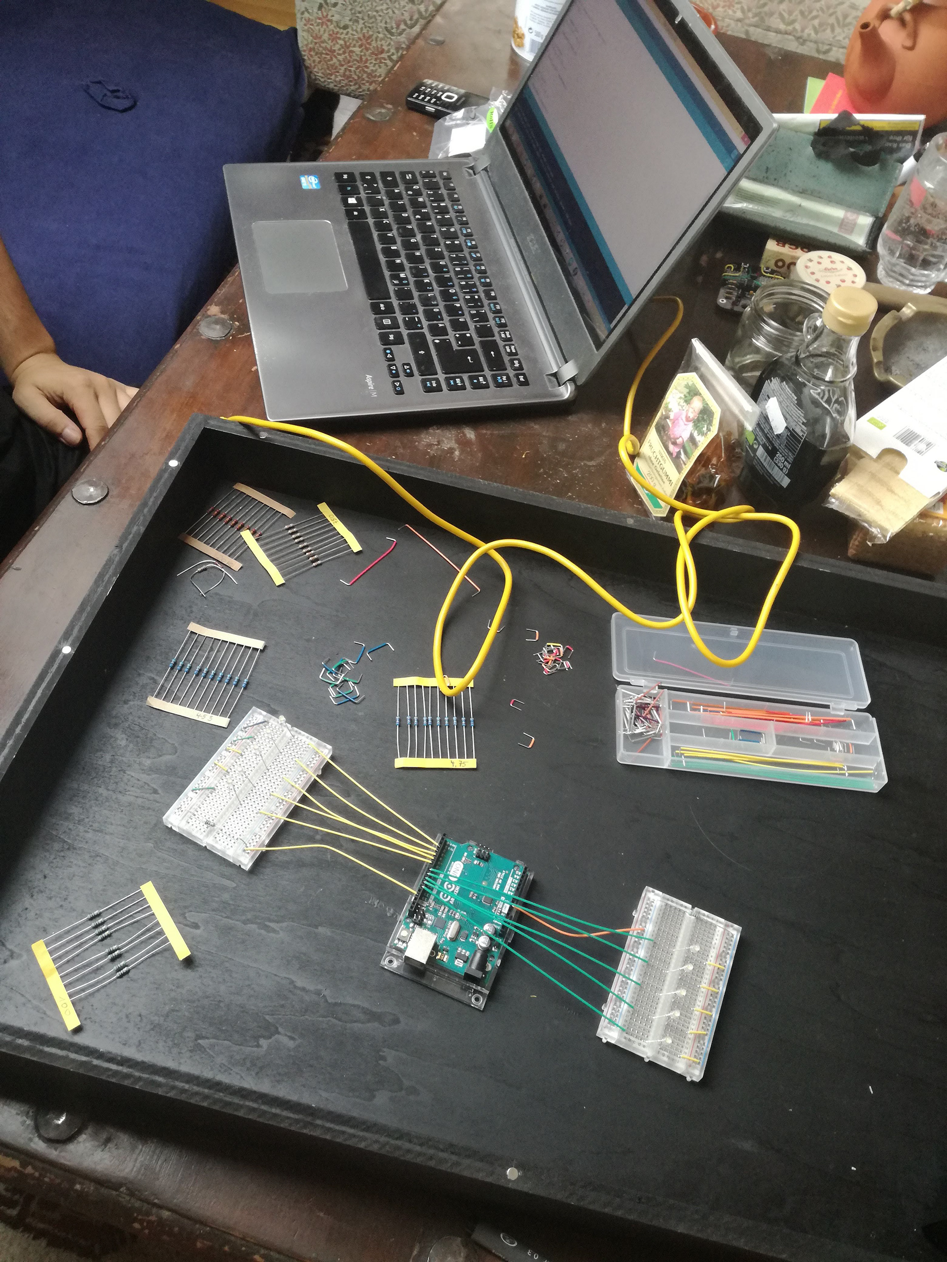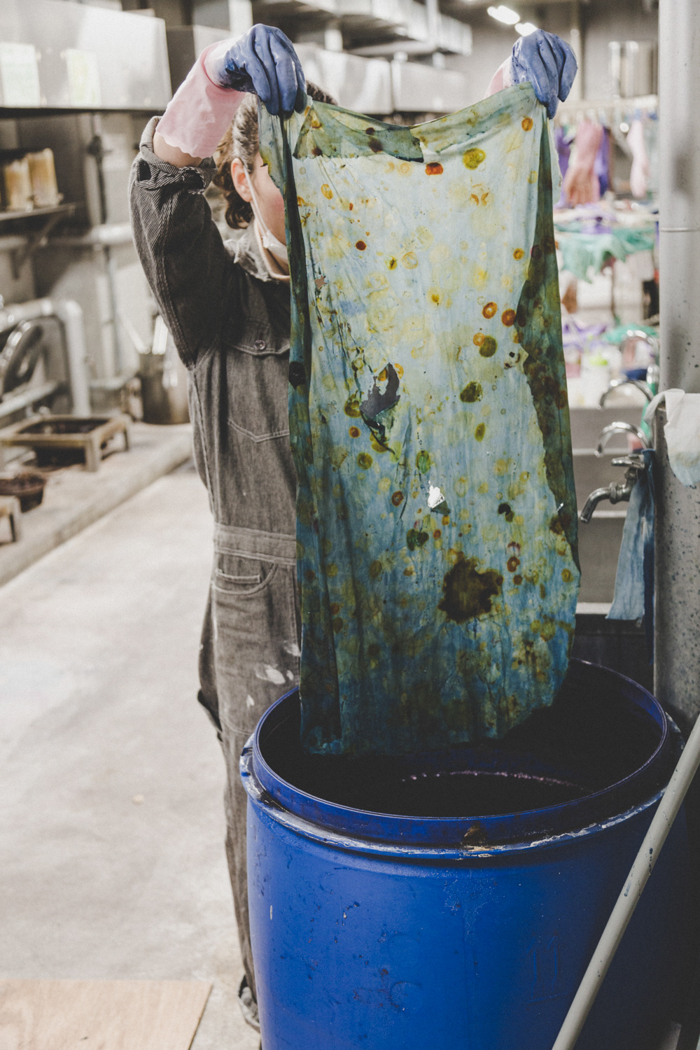 Mit Indigo gefärbter Kombucha, getrocknet auf Plexiglas und Holzplatte, LEDs, Arduino, Booklet