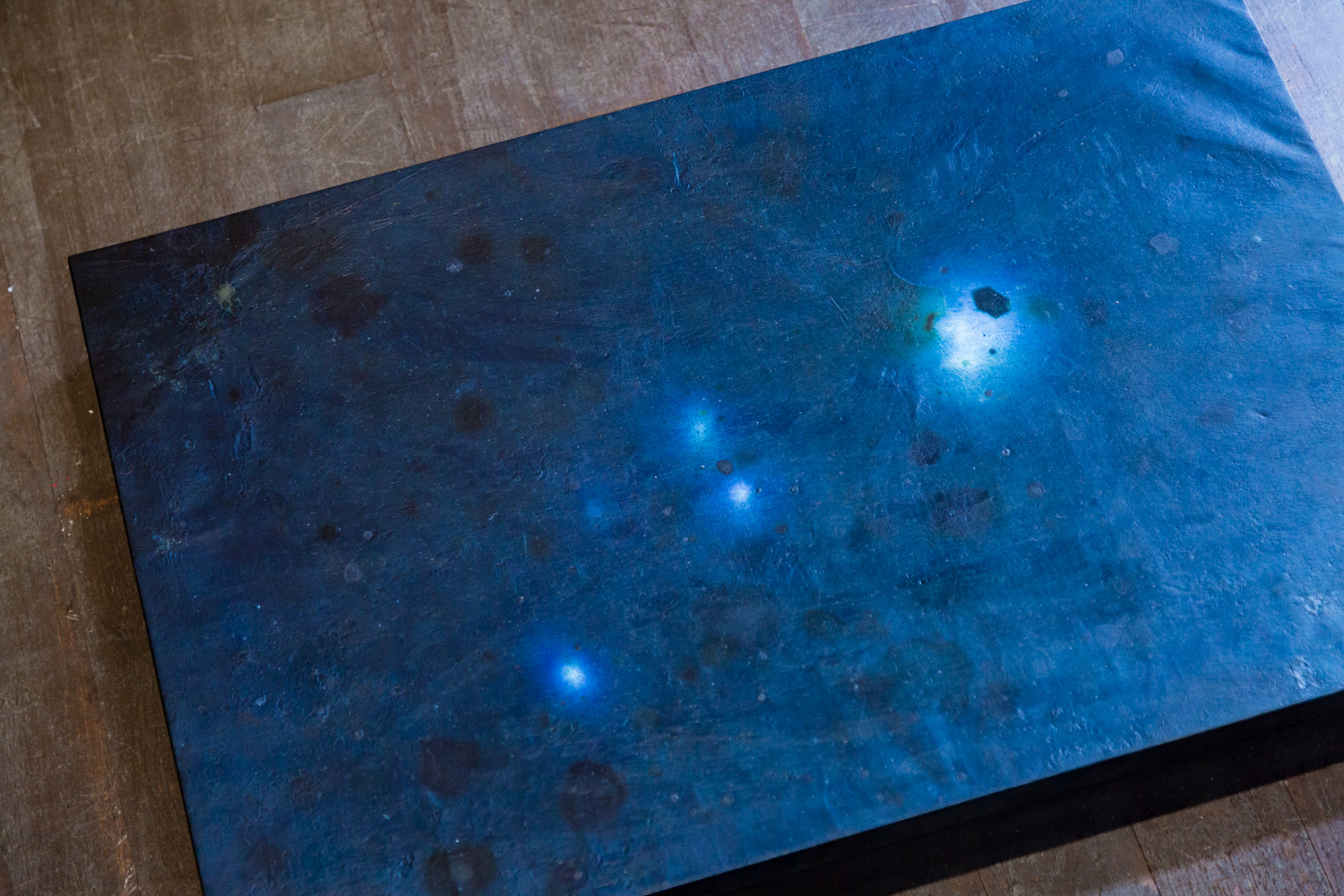 Mit Indigo gefärbter Kombucha, getrocknet auf Plexiglas und Holzplatte, LEDs, Arduino, Booklet